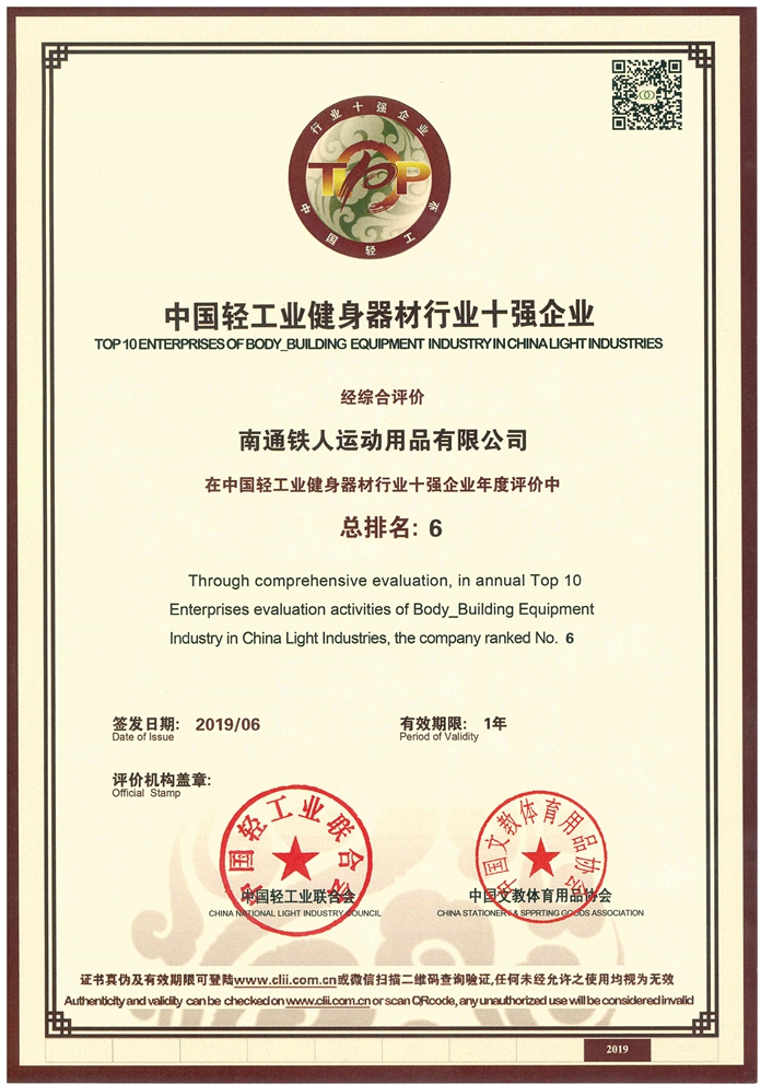 | 2019 | 2019中國輕工業健身器材行業十強企業 | 中國輕工業聯合會、中國文教體育用品協會 |